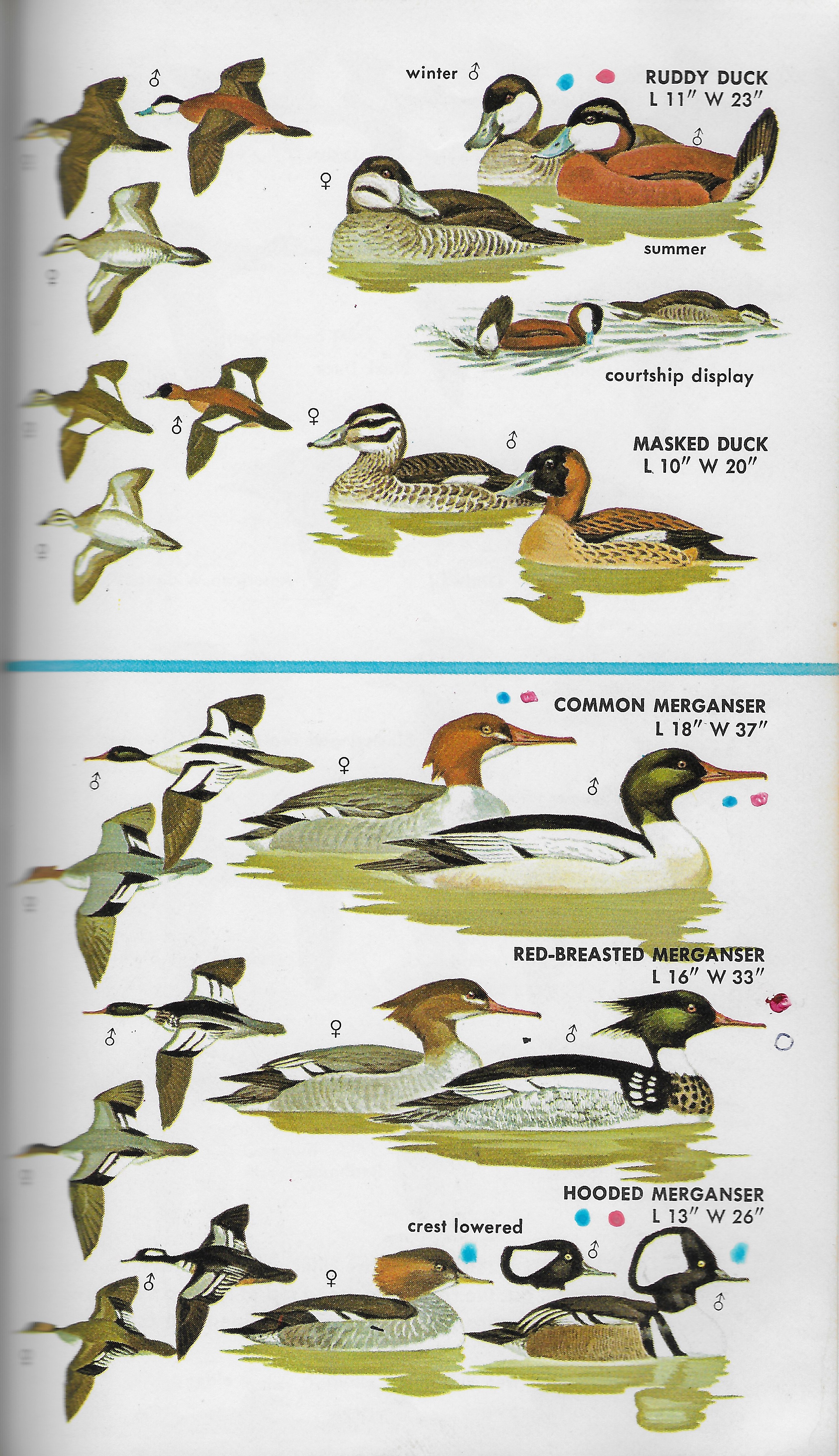 My dad and I drew dots in the bird book beside the birds we'd seen. We used red dots for him and blue for me, as shown on one of the duck pages. I remember the day we saw that ruddy duck because I thought the blue bill was quite exciting, and we had never seen so many species on the creek at the same time!